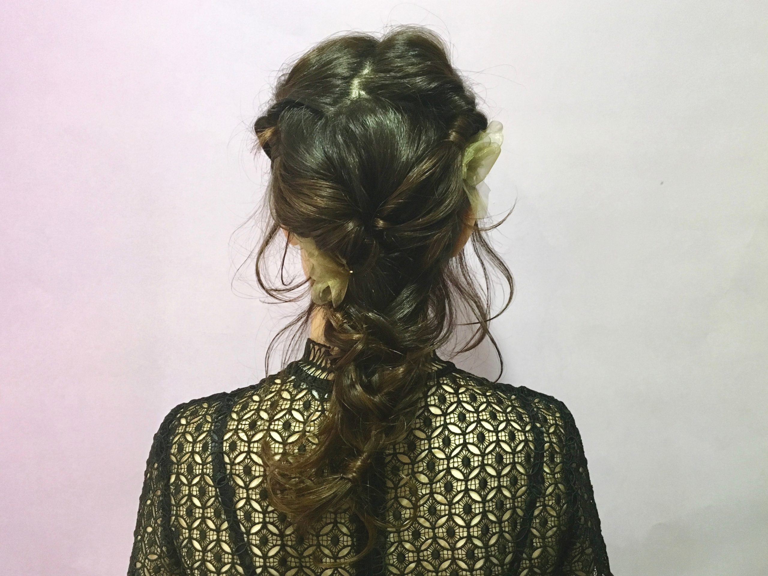 ねじったり、少し編んだりして、絶妙なゆるさ加減がかわいいパーティーアレンジスタイルです